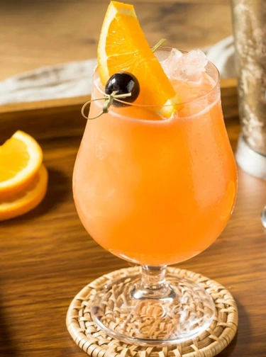 Filtrez la glace dans un verre tulipe et décorez d’une belle tranche de citron, d’orange ou d’une cerise. Ce cocktail est traditionnellement bu à Mardi Gras du fait de ses couleurs vives et éclatantes. Le verre tulipe est privilégié pour la présentation de ce cocktail pour mettre en avant ces belles couleurs appelé aussi verre hurricane !