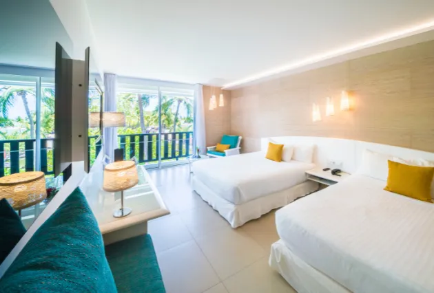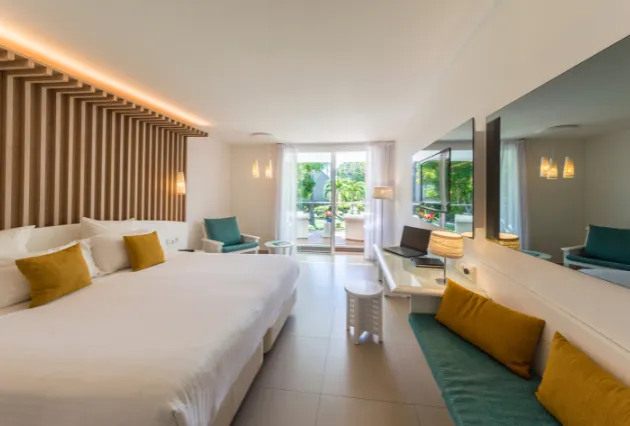 Certaines chambres s’ouvrent sur des terrasses privées, des vues sur le jardin ou la mer, idéales pour profiter pleinement de la douceur de vivre caribéenne.