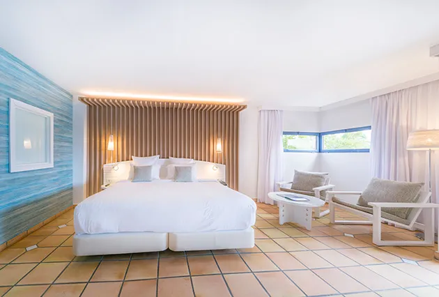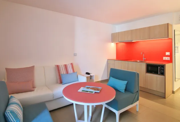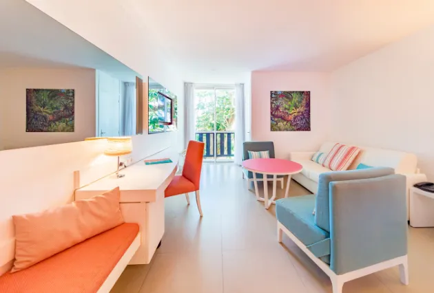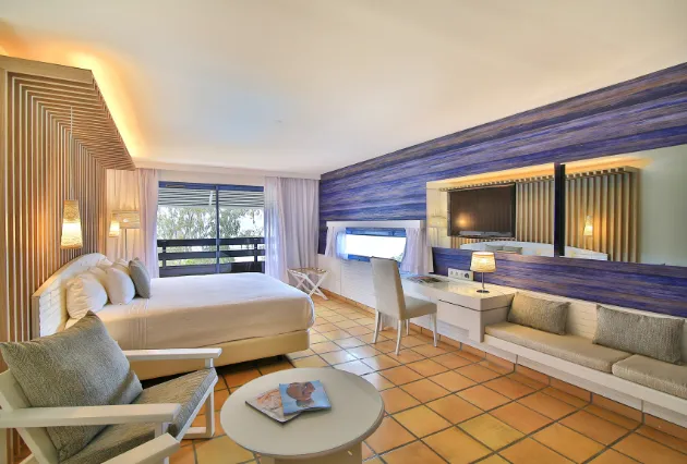 Pensées pour les familles, la Junior Suite Famille Terrasse offre un espace fonctionnel et lumineux avec vue sur le jardin tropical. Au rez-de-chaussée, la chambre principale dispose d’un lit king size et d’une terrasse privative, tandis que le salon est équipé d’un canapé-lit et d’une kitchenette, garantissant confort et indépendance pour tous les membres de la famille.