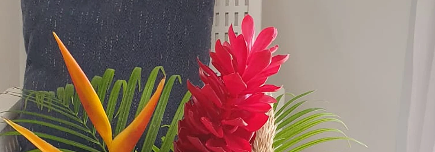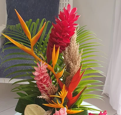 Un bouquet coloré et élégant composé de fleurs tropicales fraîches (orchidées, anthuriums, oiseaux du paradis selon saison). Parfait pour offrir une touche d’exotisme et de raffinement.